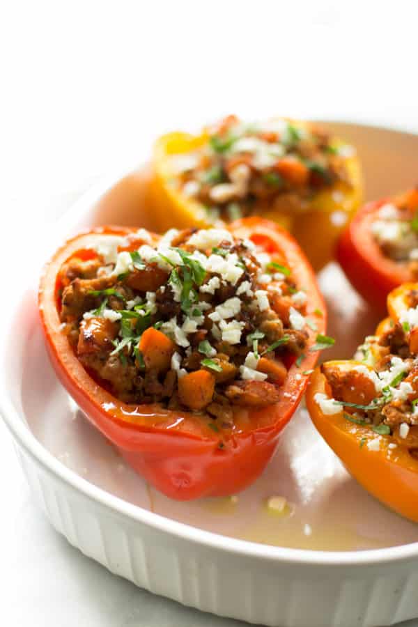- Fill each bell pepper half with the ground turkey-sweet potato mix.