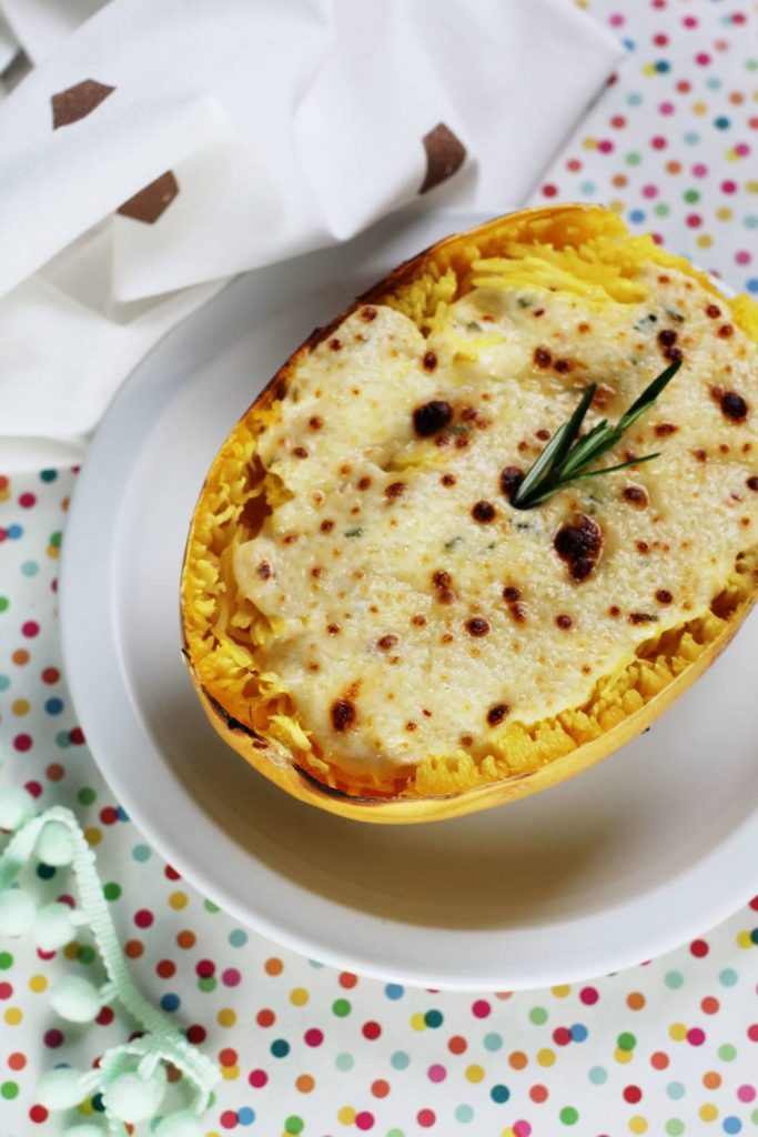 - With a fork, gently “shred” the interior of the spaghetti squash halves. It will resemble pasta!. Pour the sauce over each half.