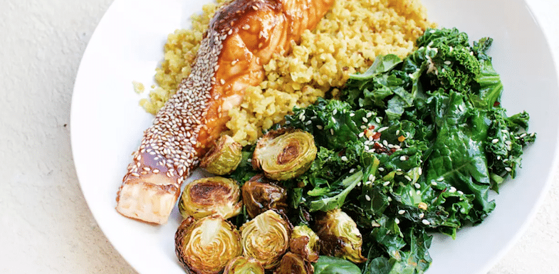 Gluten and dairy-free, this bowl will soothe your digestive system with turmeric and salmon’s anti-inflammatory power. It’s filled with nutrients and fiber from the greens and liver-detoxifying enzymes in cauliflower and brussels sprouts. Salmon is full of anti-inflammatory omega-3 fatty acids. The rosy pink color of salmon is due to carotenoids which also has anti-inflammatory properties.