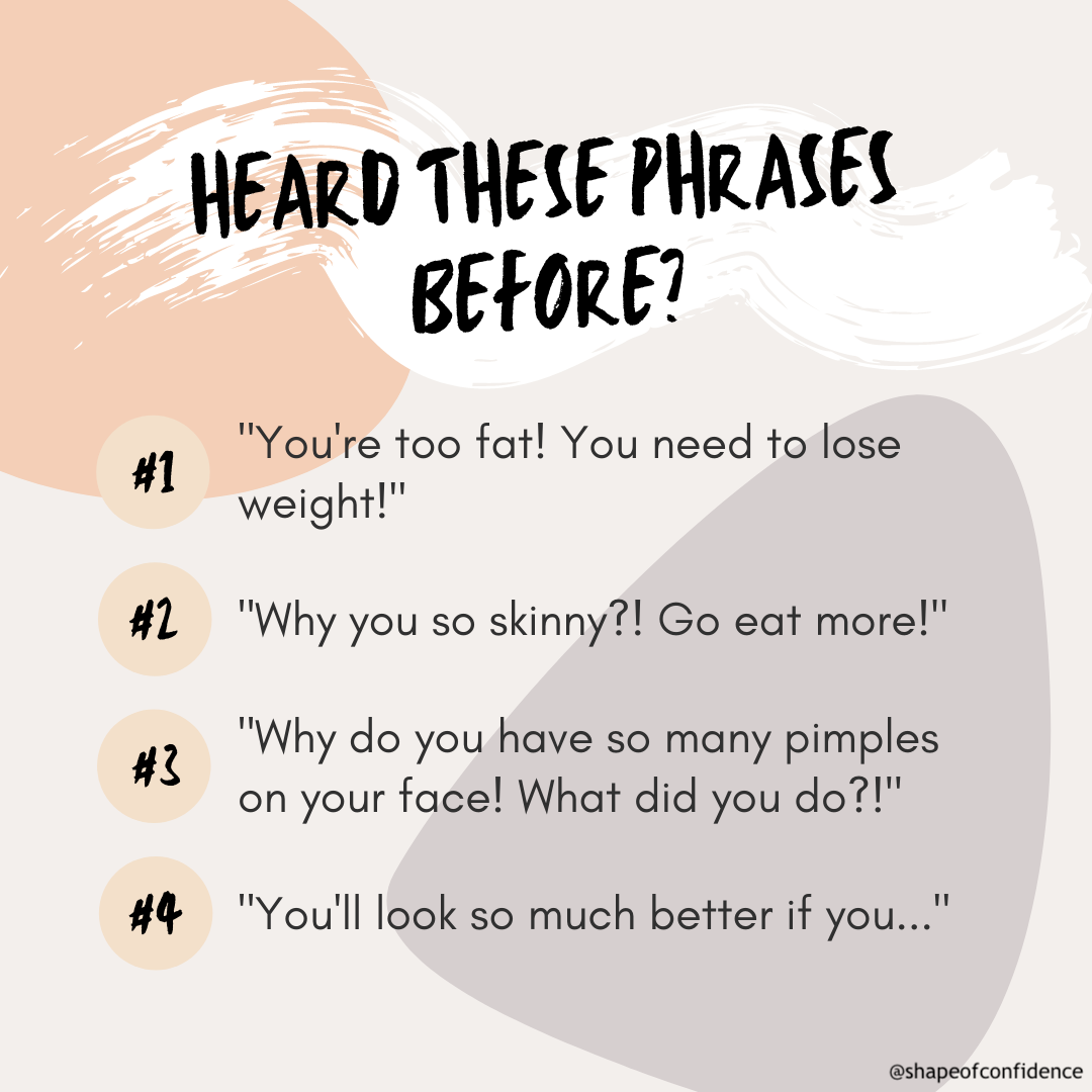 Seek help if the negative thoughts, feelings or emotions are too overwhelming for you to handle and they continue to persist to the point it is affecting your functioning. It is important to know when and who to seek help from. Find a professional (counsellor, psychologist, psychiatrist, etc) who can work together with you. Remember that you are not alone. Having body image issues may seem like a lonely journey, and while knowing that more people do experience similar struggles as you does not take away your pain, it may be seen as a community that can be built. With the solidarity, comes strength and accountability as we embark on our own journeys of self-acceptance.