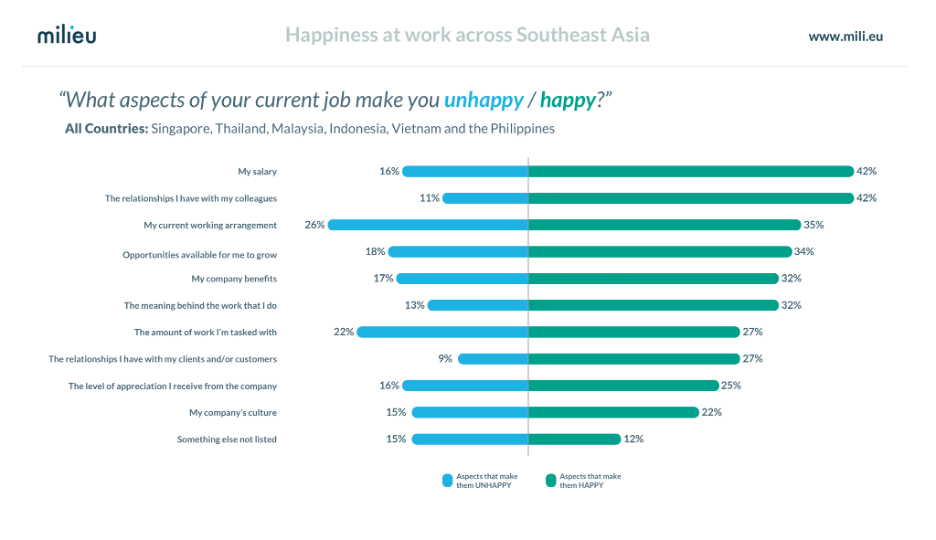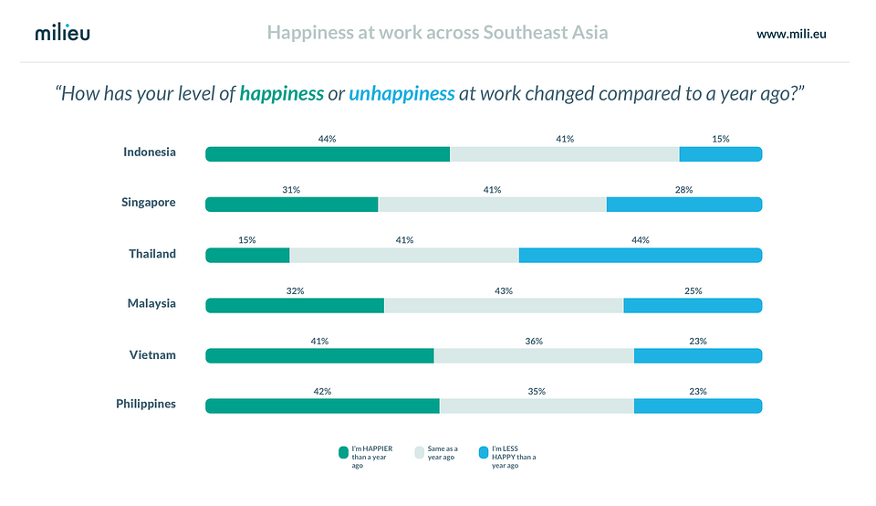 As part of worldwide events to celebrate International Week of Happiness at Work (20 – 26 September 2021), Milieu Insight has released the results of their “Happiness at Work” study based on more than n=6,800 working professionals from across Southeast Asia (Indonesia, Malaysia, Philippines, Singapore, Thailand, and Vietnam).
