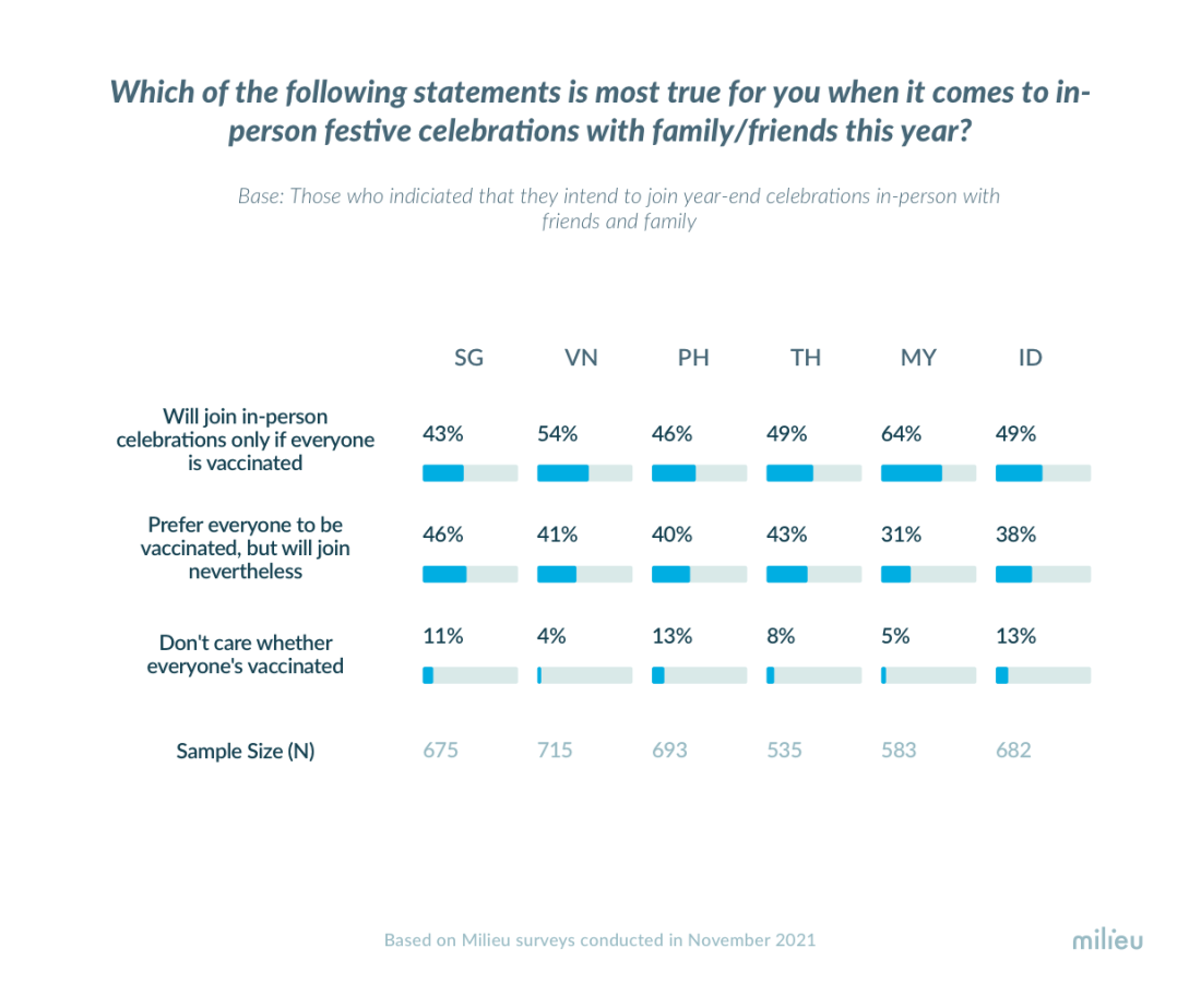 According to the study, 65% of people across Southeast Asia intend to join in-person year-end celebrations with their loved ones, among which 51% will only join if all attendees are fully vaccinated, while 49% will do so regardless of the attendees’ vaccination status.