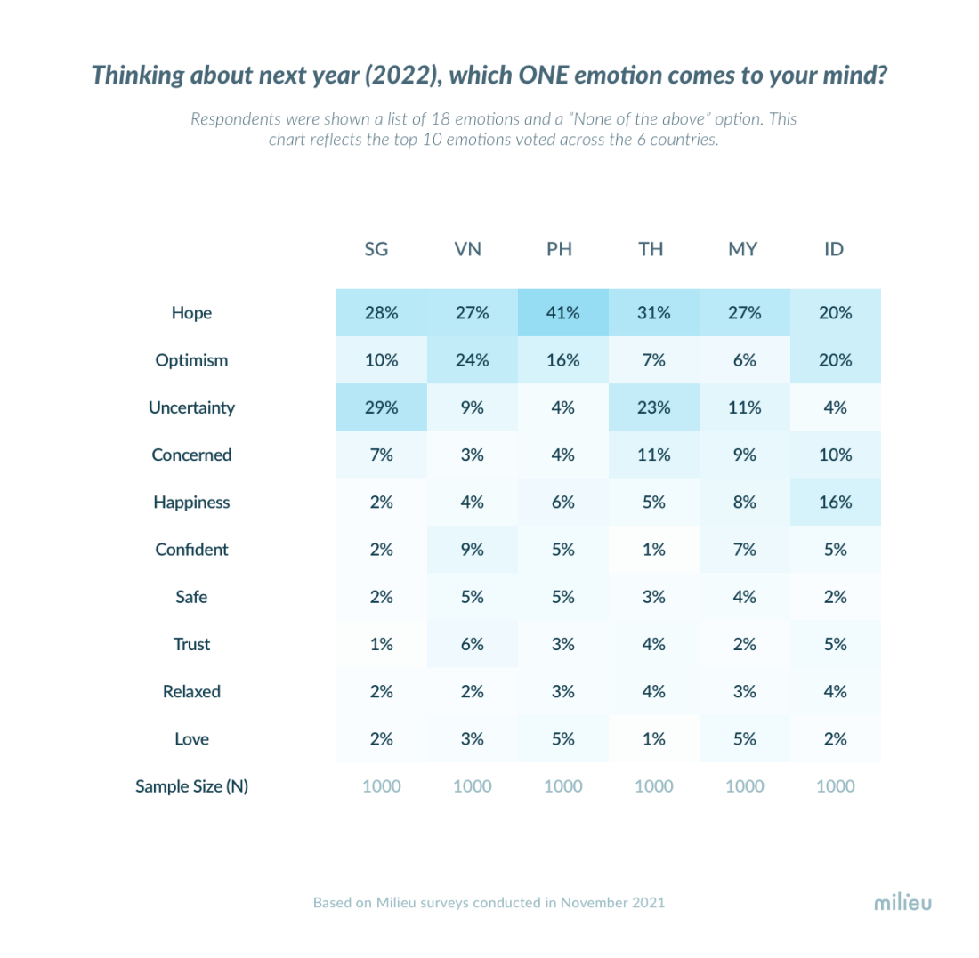 - Hope emerged as the top emotion that people feel towards 2022. The Philippines in particular (41%). While people are hopeful that the Covid-19 situation will improve, they are also reserved about it – uncertainty is also one of the top 3 voted emotions in most SEA countries, particularly in Singapore (29%), Thailand (23%) and Malaysia (11%).