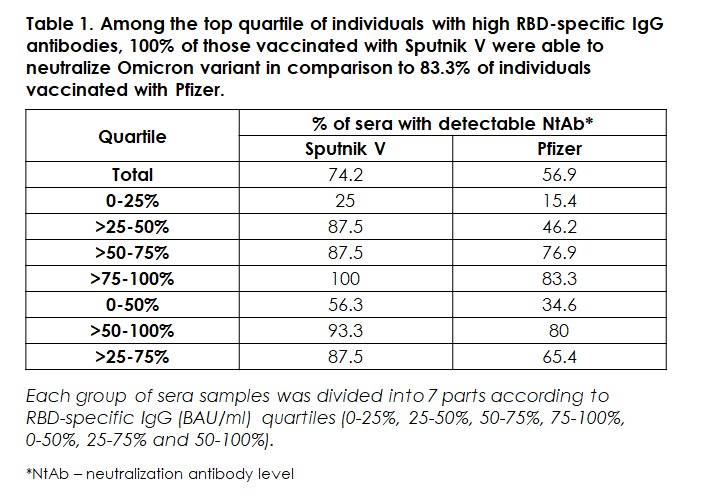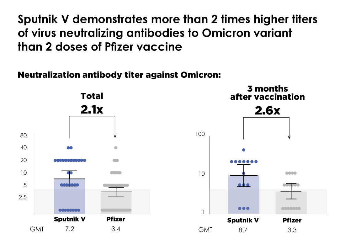 According to an announcement by the Gamaleya National Research Center of Epidemiology and Microbiology (Gamaleya Center) and the Russian Direct Investment Fund (RDIF, Russia’s sovereign wealth fund, investor in Sputnik V and Sputnik Light coronavirus vaccines), a unique independent comparative study conducted at the National Institute for Infectious Diseases Lazzaro Spallanzani (Italy) by a joint team of researchers of the Institute and the Gamaleya Center showing that 2 doses of Sputnik V provide more than 2 times higher geometric mean titers (GMT) of virus neutralising antibodies to the Omicron variant of COVID than 2 doses of Pfizer vaccine (2.1 times higher in total and 2.6 times higher 3 months after vaccination).