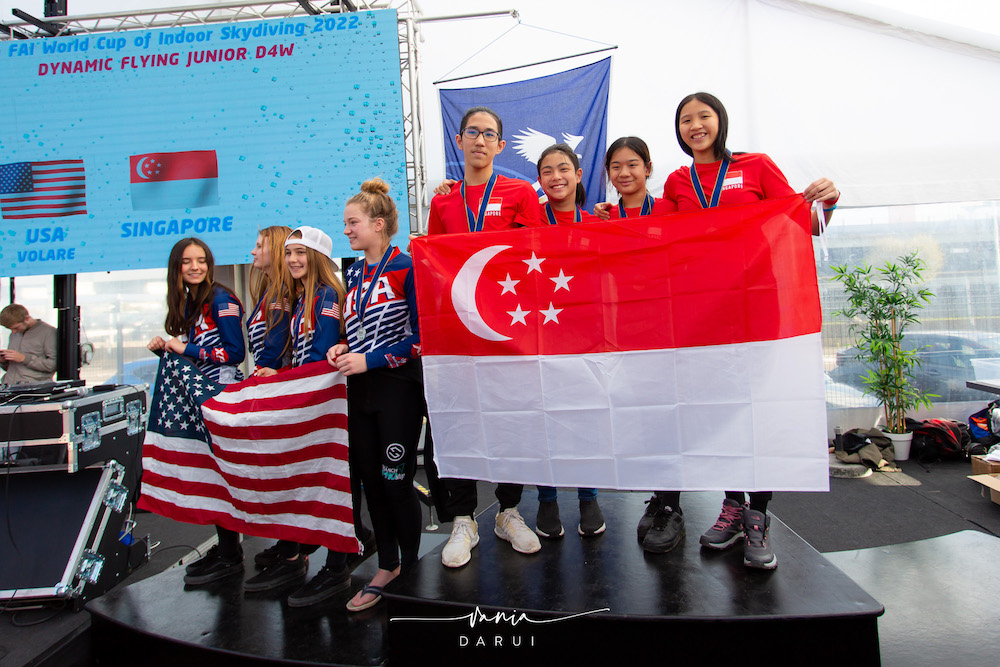 The team tested their mettle in the world’s largest indoor skydiving competition – the 4th FAI World Cup of Indoor Skydiving 2022 (WCIS), held from April 5 to 10 in Charleroi, Belgium. The young indoor skydiving team, which comprises Kyra Poh (19), Kai Minejima-Lee (13), Vera Poh (12), Isabelle Koh (14), and Jordan Lee (17), participated in the Freestyle (Open), Freestyle (Junior), 2-Way Dynamic Junior (Speed and Free), and 4-Way Dynamic Junior (Speed) disciplines.