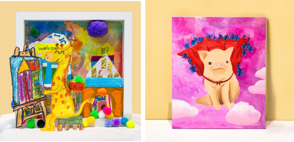 The result of this project leads to the art auction showcase titled “My Own Mountain to Climb”, that encourages children to reflect on a difficult challenge that they have overcome and to share that moment and achievement with others viewing their artwork. For instance, in The Giraffe Who Paints in the Playground by Jacob Chin, Jacob the Giraffe loves painting but often makes a mess. He decides that all he needs are the right tools and he can paint anywhere! I Can Fly!, by Kayla Ng, tells the story of a piglet’s wish to fly. Working hard for a solution and seeking the help of a group of blue butterflies, they worked together to overcome the odds, and helped the little piglet lift her trotters off the ground. These artworks and more will be exhibited and open for auction from now until the 10th September.