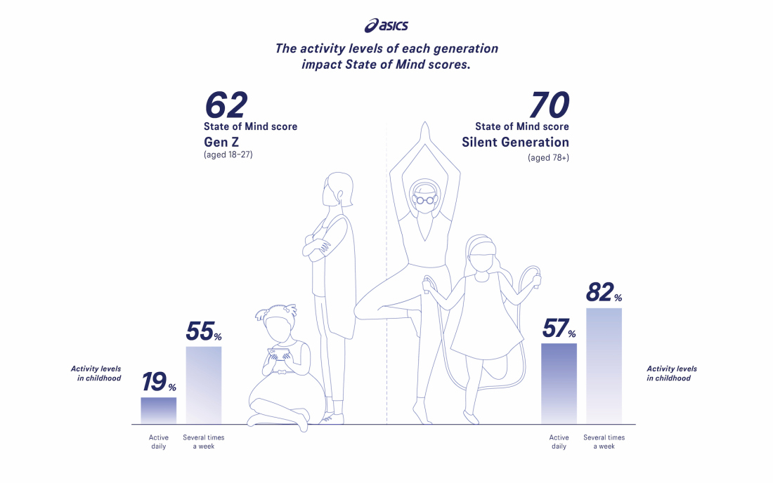 It is worrying to see this decline in activity levels from younger respondents at such a critical age, particularly as the study uncovered an association with lower wellbeing in adulthood. Gen Zs across the world are already exhibiting the lowest State of Mind scores (62/100) in comparison to the Silent Generation (70/100), so this could be hugely impactful for future mental wellbeing across the world.”