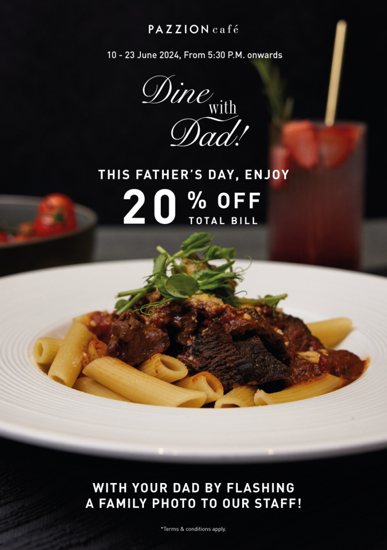 This Father’s Day, treat your dad to a delightful meal at Pazzion Cafe, where he can indulge in our delectable menu offerings in a warm and inviting atmosphere. Capture the essence of family togetherness and create cherished memories over a delicious dinner. From 10th to 23rd June, after 5.30pm, simply flash a family photo to their staff to enjoy 20% off the total bill.