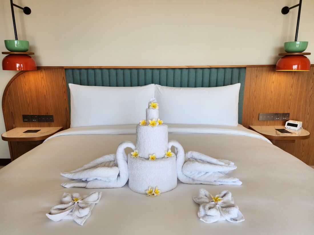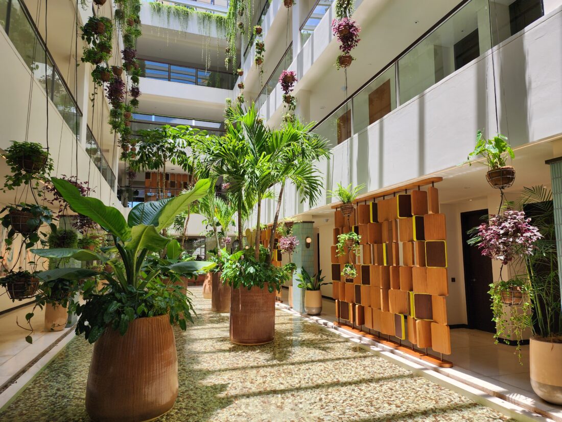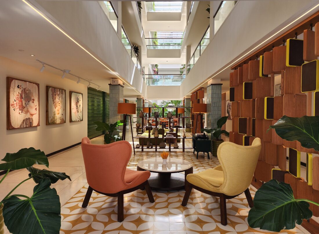 KLEO’s architectural layout is intentionally social. The bright interiors are alive with tropical plants, geometric shapes, bold pops of pastel hues, and tactile detailings that you can interact with. This is a space and place where solo travellers make friends spontaneously over breakfast, and couples drift from poolside cocktail to dinner without ever needing to leave the property.