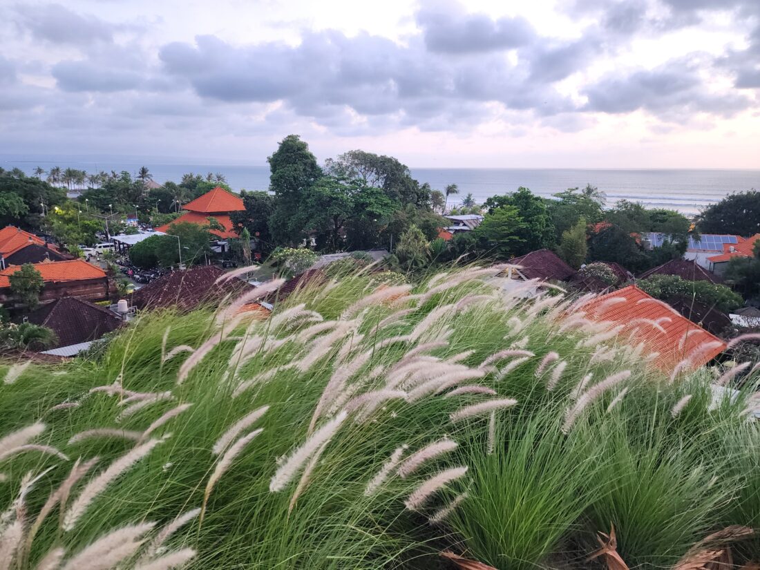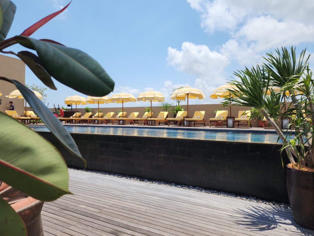During the day, sunlight filters through palm fronds onto breezy open-air terrazzo corridors with placid water features. At dusk, the Rooftop Social bar transforms into a communal twilight lounge to admire mesmerising sunsets. The entire pool deck feels like a secret rooftop garden that is framed by sunny yellow and white stripped umbrellas. Expect an eclectic music playlist that drifts from tropical funk to mellow house, cocktails made with local ingredients, and views that stretch across Seminyak’s rooftops to the Indian Ocean.