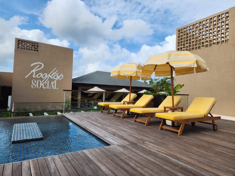 During the day, sunlight filters through palm fronds onto breezy open-air terrazzo corridors with placid water features. At dusk, the Rooftop Social bar transforms into a communal twilight lounge to admire mesmerising sunsets. The entire pool deck feels like a secret rooftop garden that is framed by sunny yellow and white stripped umbrellas. Expect an eclectic music playlist that drifts from tropical funk to mellow house, cocktails made with local ingredients, and views that stretch across Seminyak’s rooftops to the Indian Ocean.