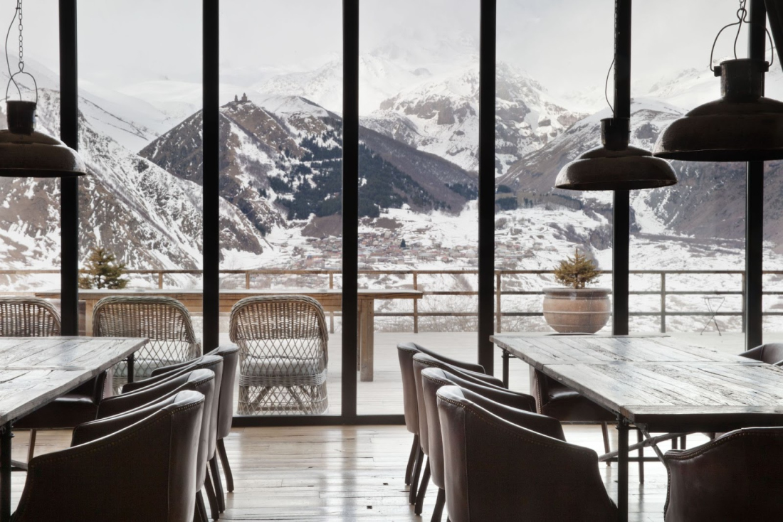 Stay in Rooms Hotel Kazbegi, a boutique mountain resort, combining a warm and inviting atmosphere with rustic elegance against a spectacular backdrop of the Caucasus Mountains.