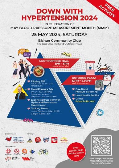 Grab your loved ones and join us at Down with Hypertension 2024 at the Outdoor Plaza, Bishan Community Club on Saturday, 25 May 2024, to take charge of your heart health. While some activities have been fully subscribed, walk-ins are more than welcome for the Outdoor Plaza activities!