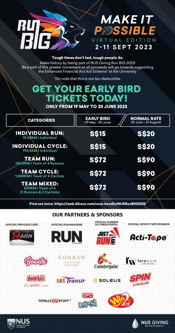 NUS Giving Run BIG is back and better than ever. From 2 to 11 September 2023, push your limits with our Virtual Challenge.