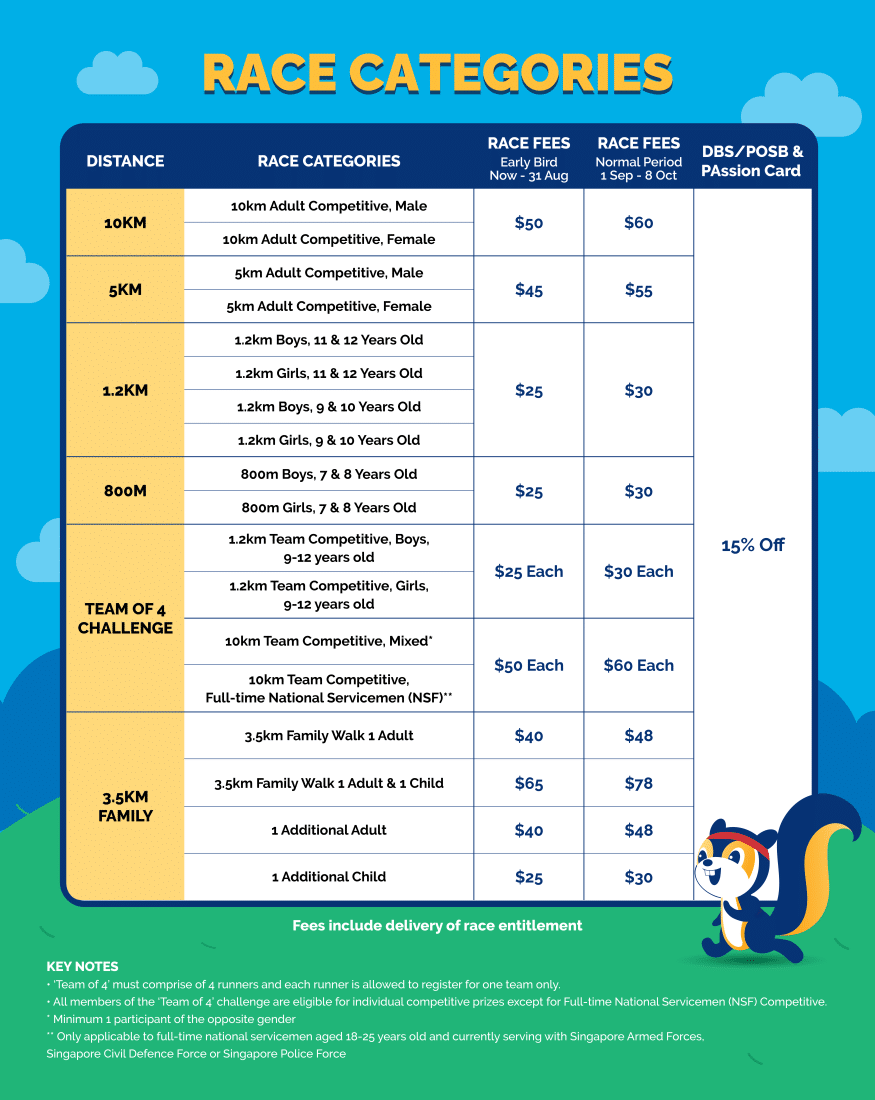 - Under the ‘Team of 4 challenge’, there will also be an inaugural race segment specially for National Servicemen, as a way of fostering a sense of camaraderie and strengthening the bond between the community and those who serve our nation. Registration is free for the first 500 NSFs who sign up by 31 August.